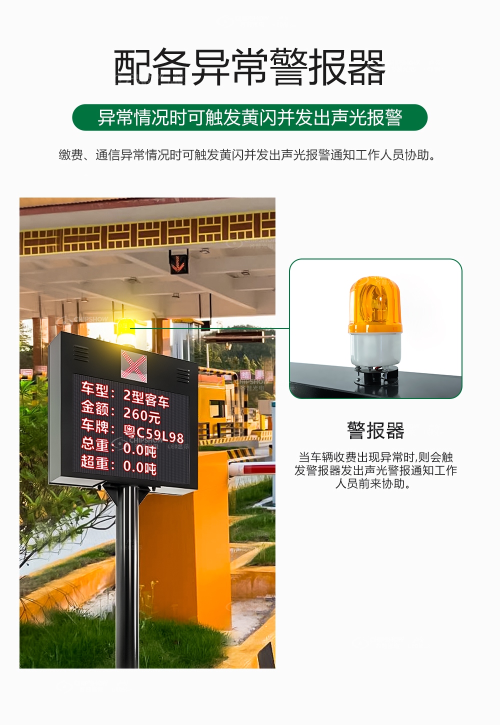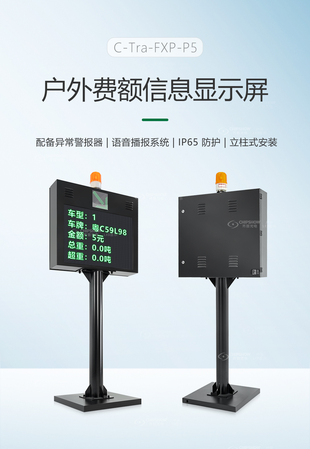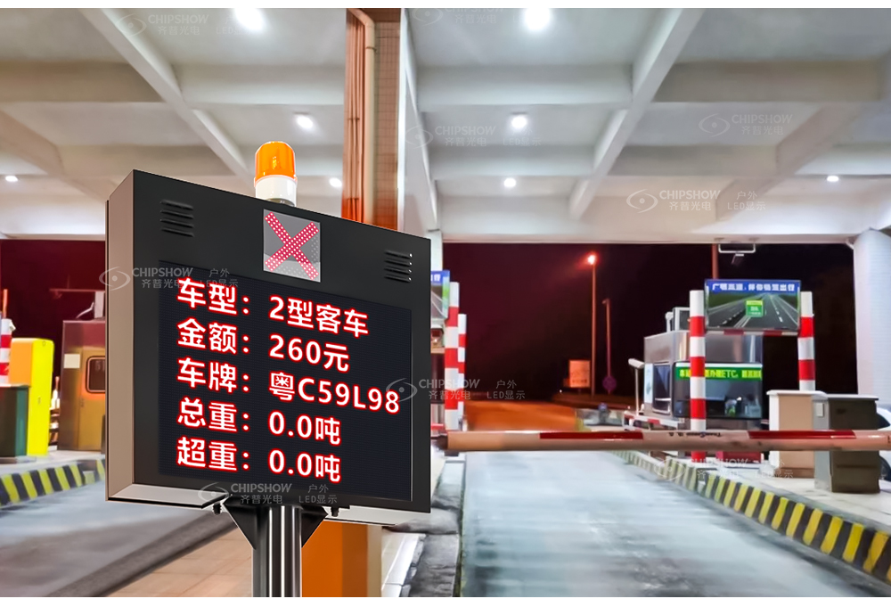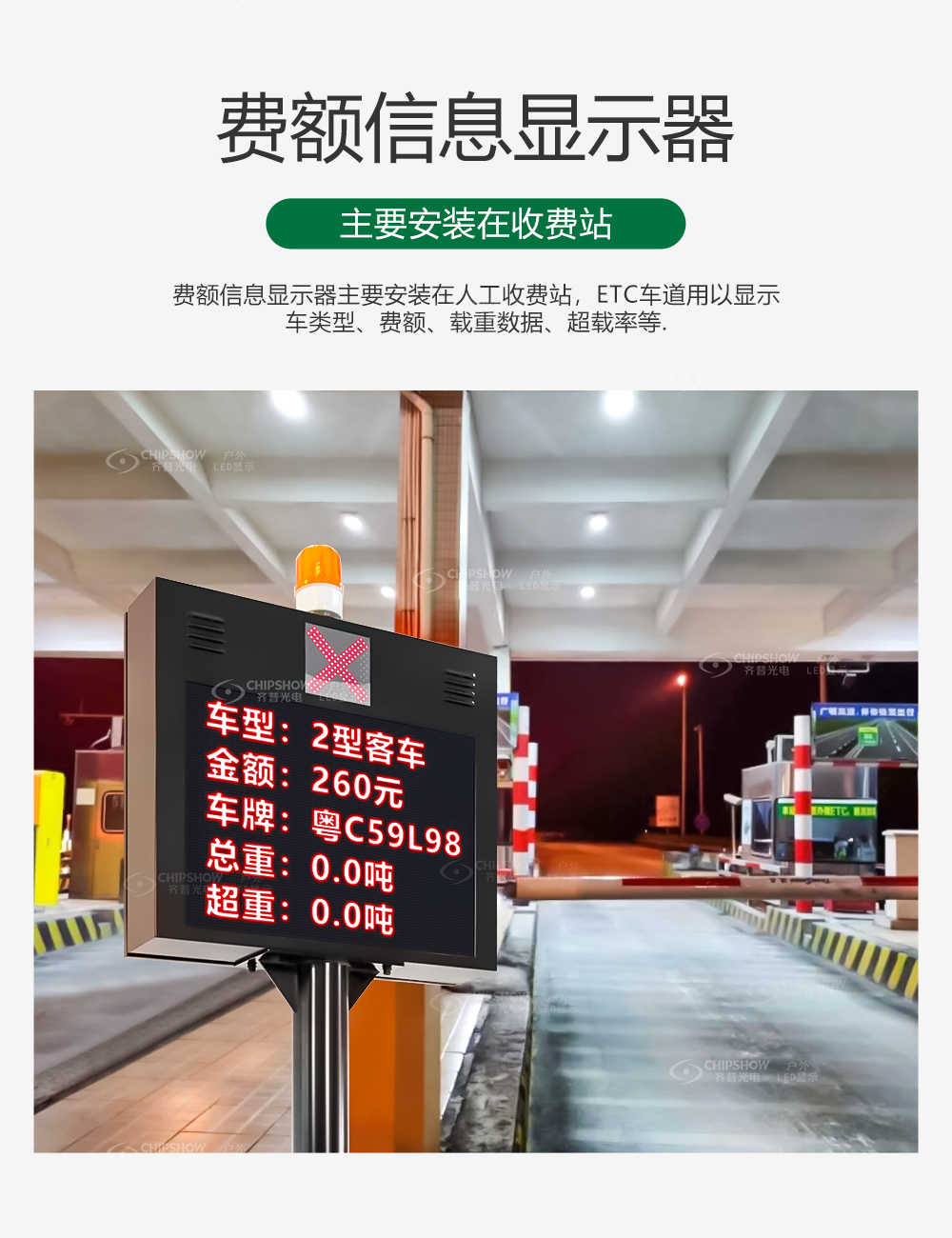 费额信息显示器主要安装在人工收费站,ETC车道用以显示汽车类型、收
