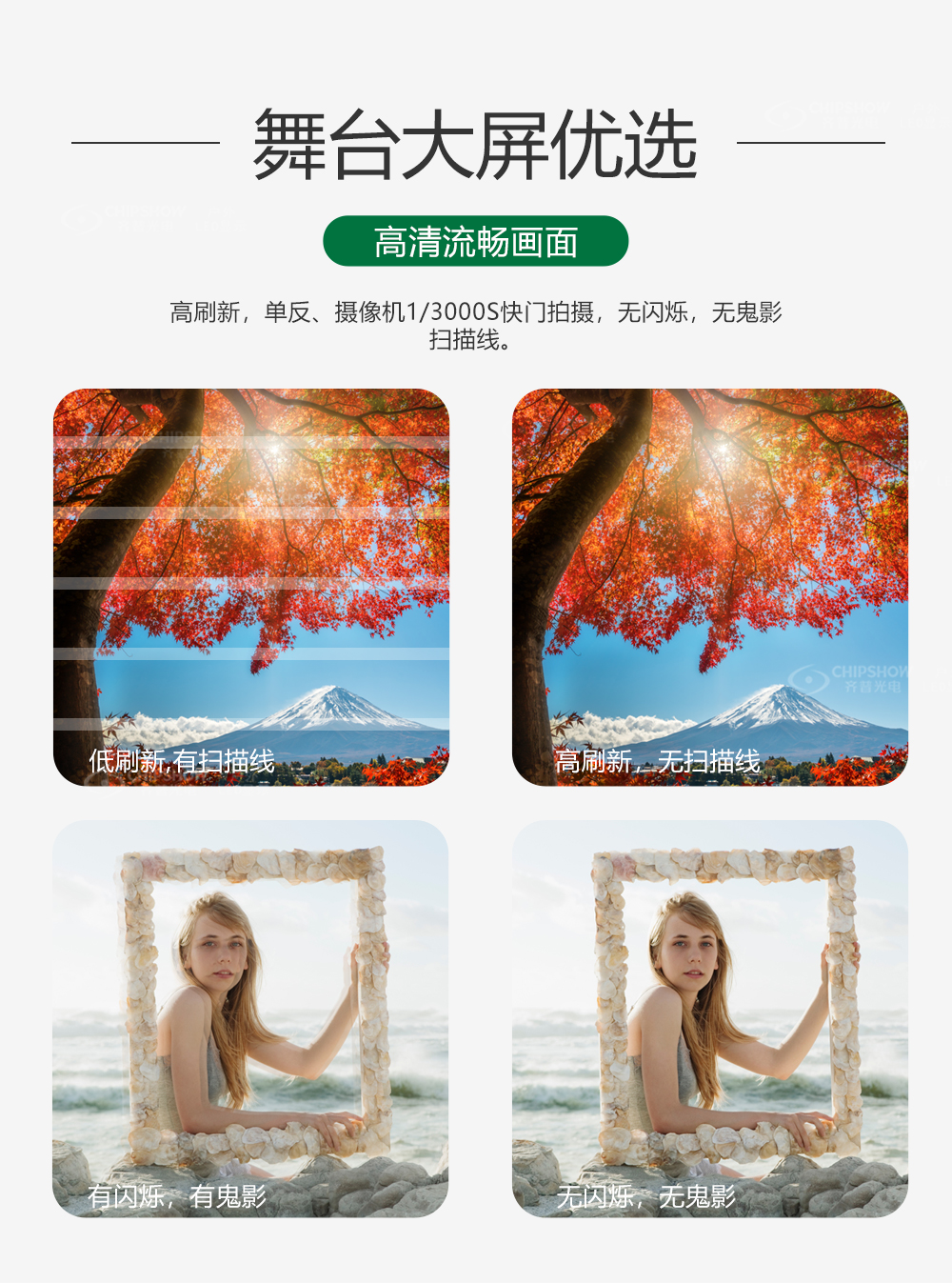 7、背景大屏优选;高刷新,单反、摄像机1/3000S快门拍摄,无闪烁,无鬼影;