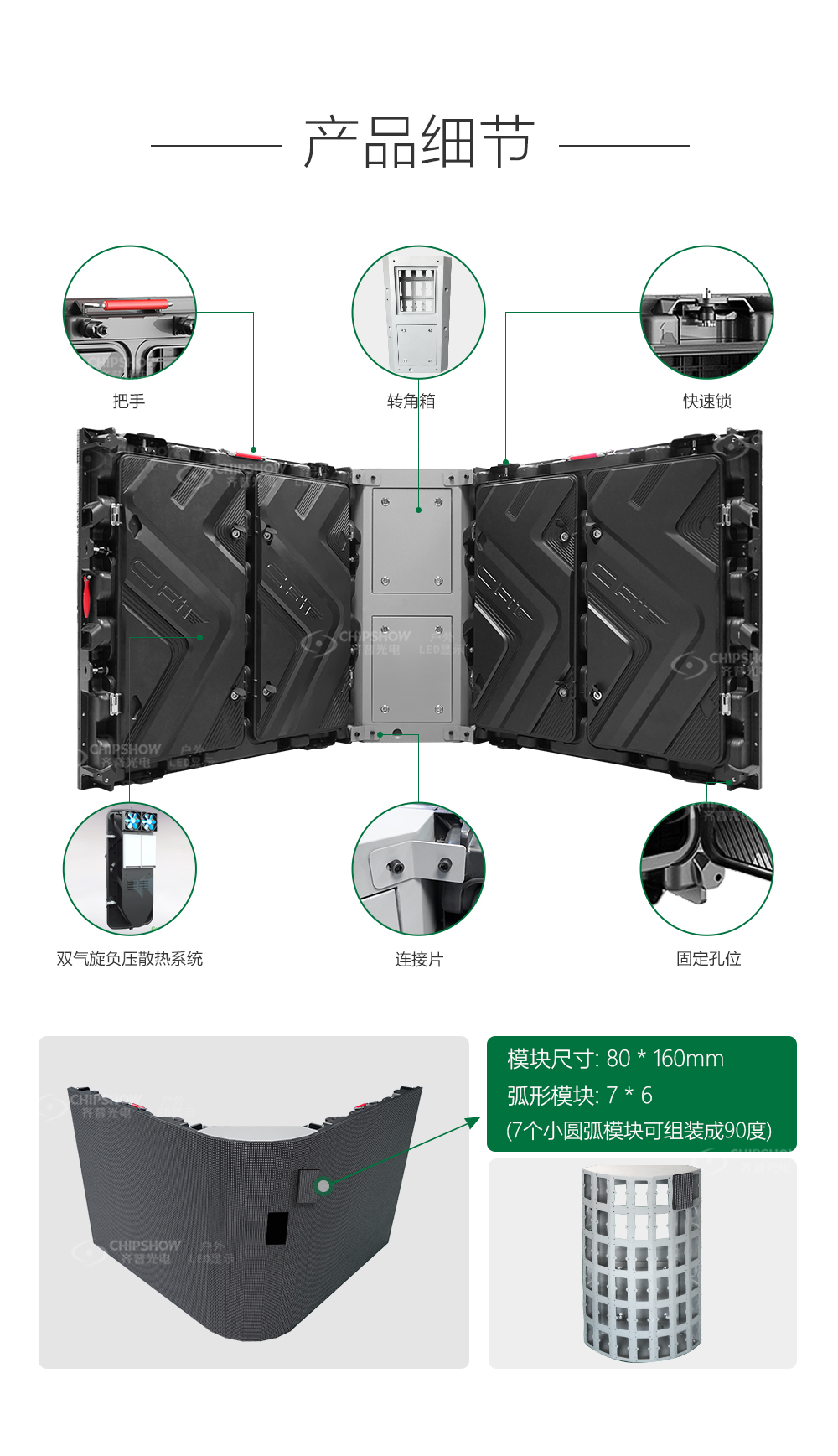 9. 弧形转角部分350vip浦京开了一个特殊弧形模组,弧形转角箱体用钣金做,两直边用350vip浦京的 C-Fit P6.667 960X960压铸箱体做。
